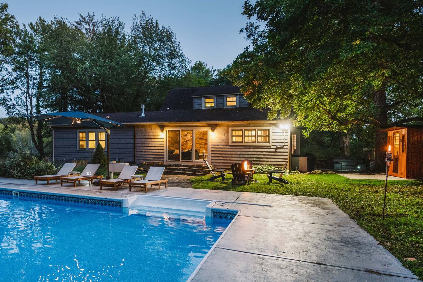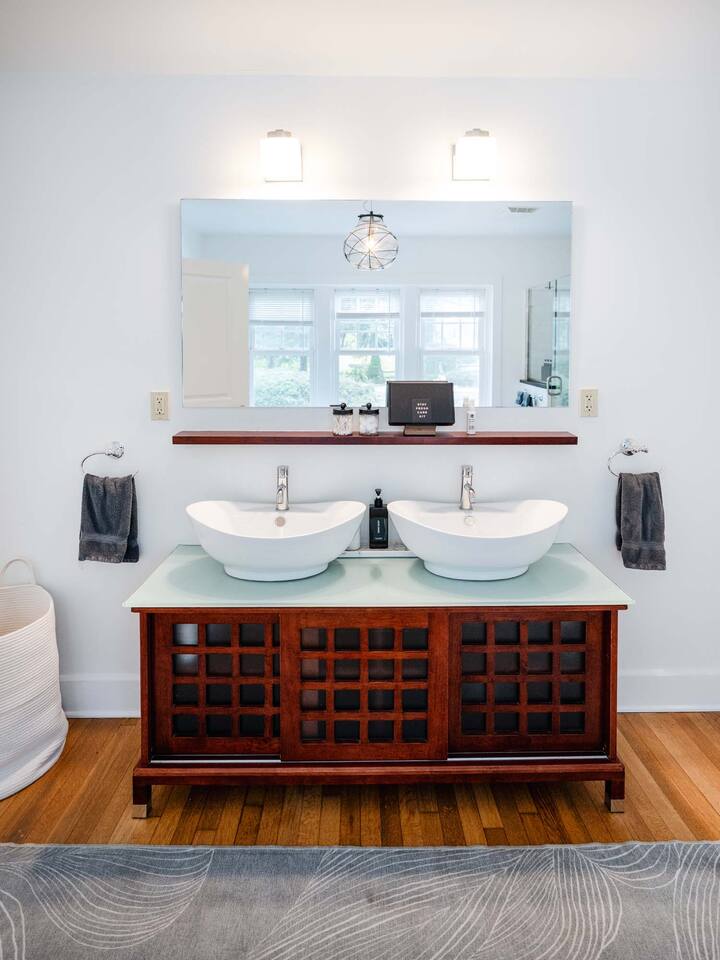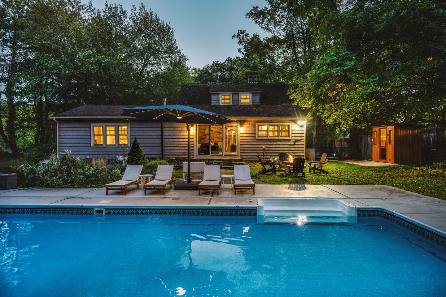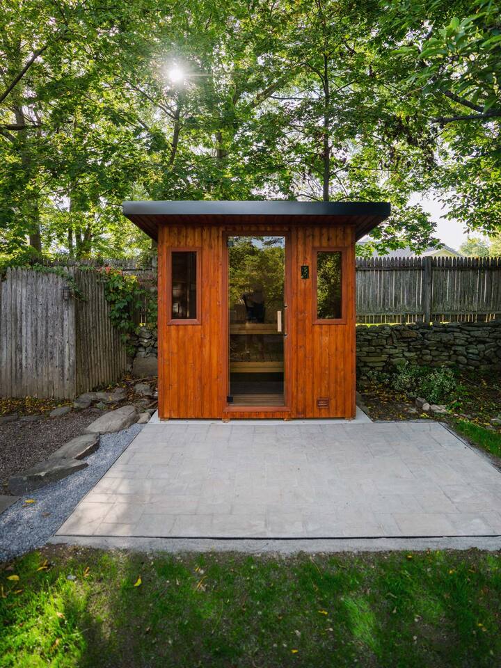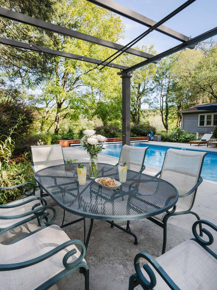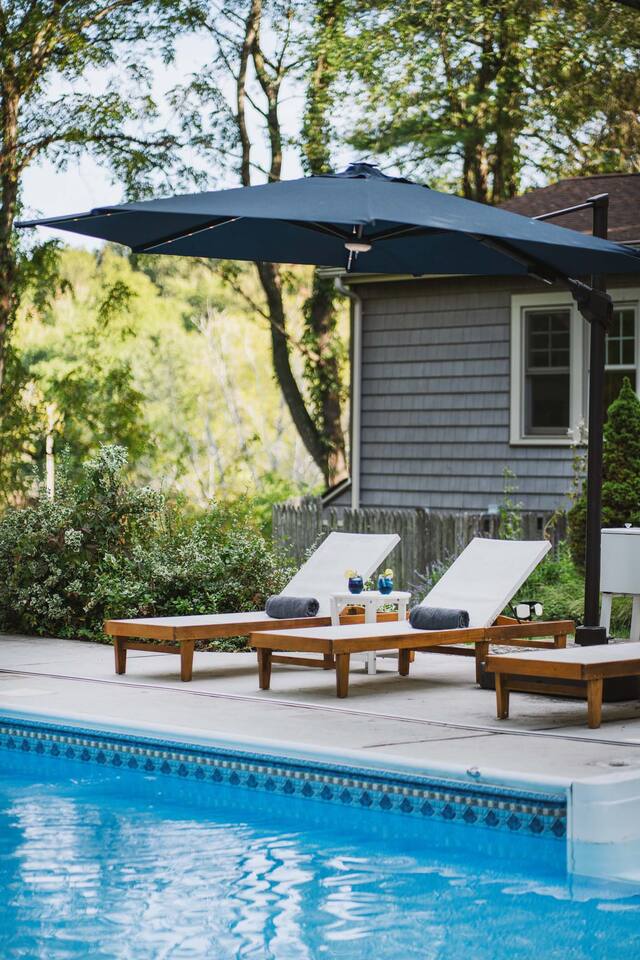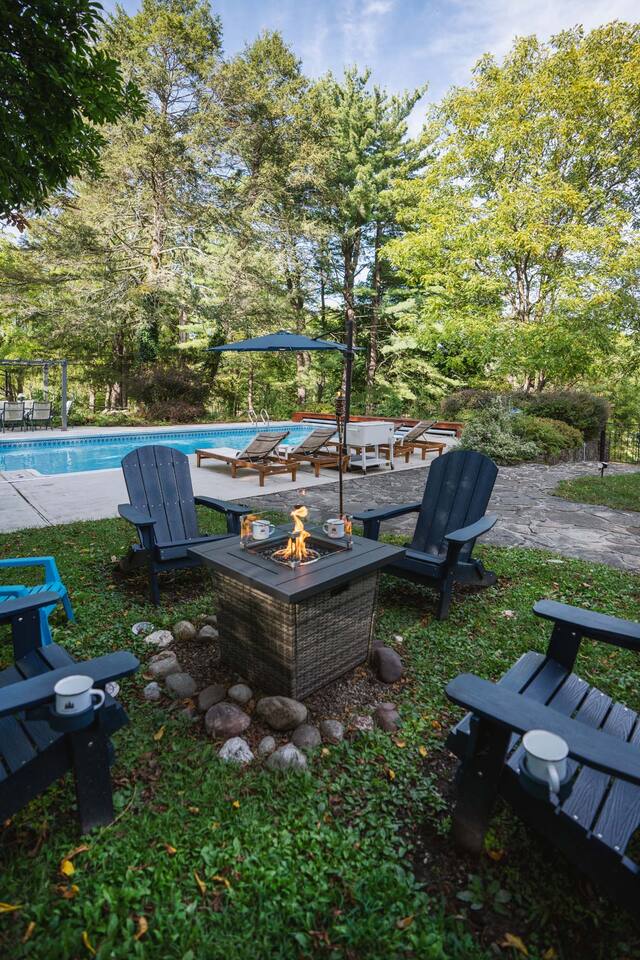 Accommodations: - Bedroom 1 (Primary): King Bed (w/ ensuite bathroom) - Bedroom 2: King Bed - Bedroom 3: King Bed - Bedroom 4: Queen Bed - 2.5 bathrooms - Large soaking tub in master bathroom - All rooms are cleaned to highest standards - High-end mattresses and linens - Central air & heat in all bedrooms Amenities: - Heated saltwater pool (private) - Luxury Finnish sauna (new!) - Premium hot tub (new!) - Professional pickleball court - Basketball court w/ brand new basket - Outdoor fire pit - Fireplace - Art station (perfect for kids!) - Nex Playground Gaming Console for Kids - Dozens of games & books (kids & adults!) - Pond - Horseback riding (borders the backyard) - Super fast Wi-Fi for remote work - Top-of-the-line desks & ergonomic chairs - Chef-quality MadeIn cookware - Luxury coffee accessories Location: - 1 min (or walk) to Storm King Art Center - 15 min to West Point (Go Army!!) - 25 min to Legoland - 10 min to Woodbury Commons (outlets) - 5 min to Storm King State Park - 20 min to Bear Mountain State Park - 5 min to top Hudson Valley trailheads - Bordered by horseback riding farm - Close to breweries, wineries & cideries Traveling with little ones? An automatic pool safety cover is available upon request to give parents extra peace of mind.