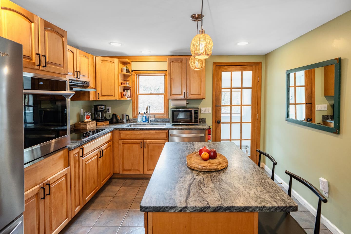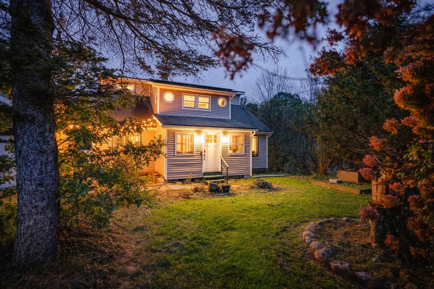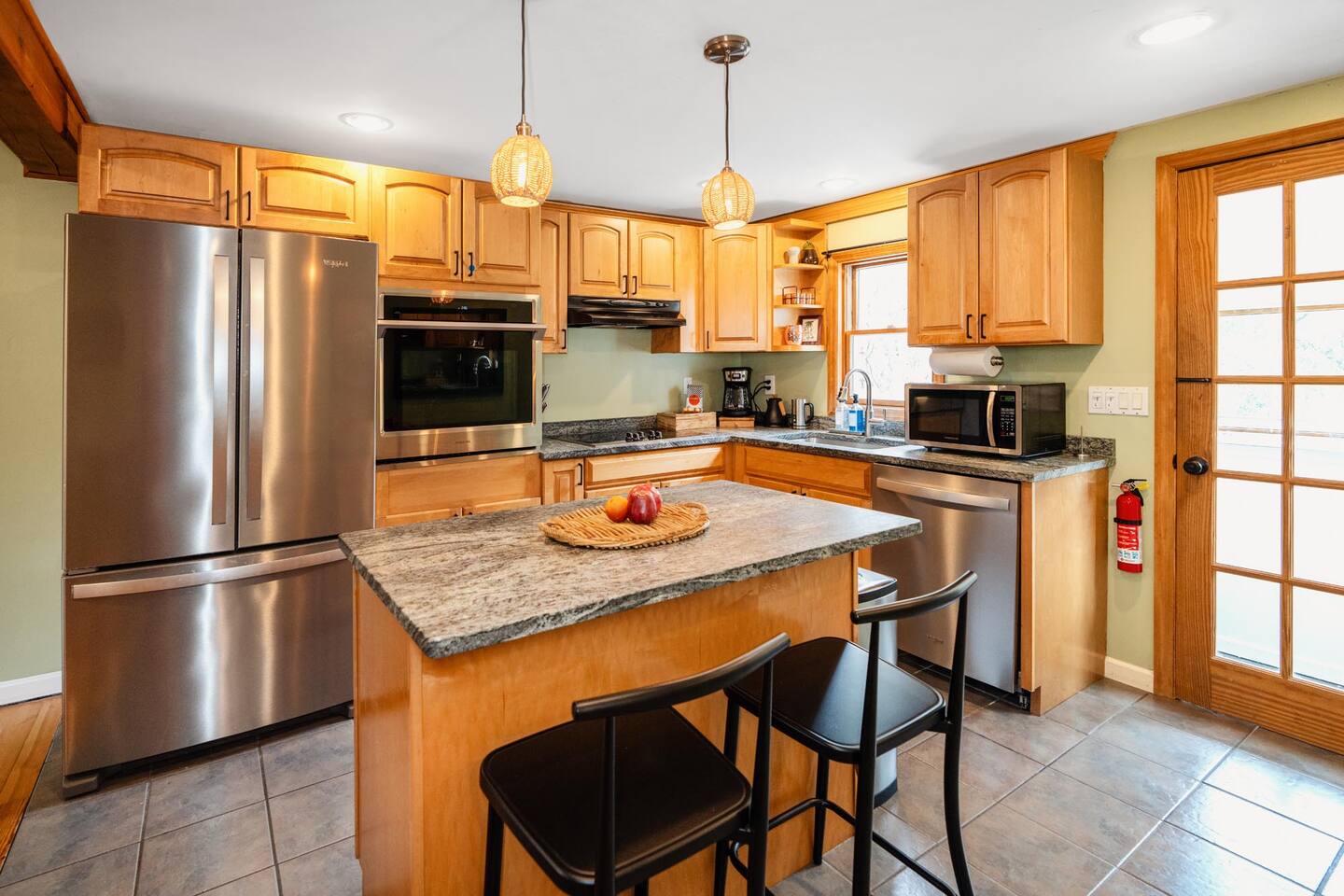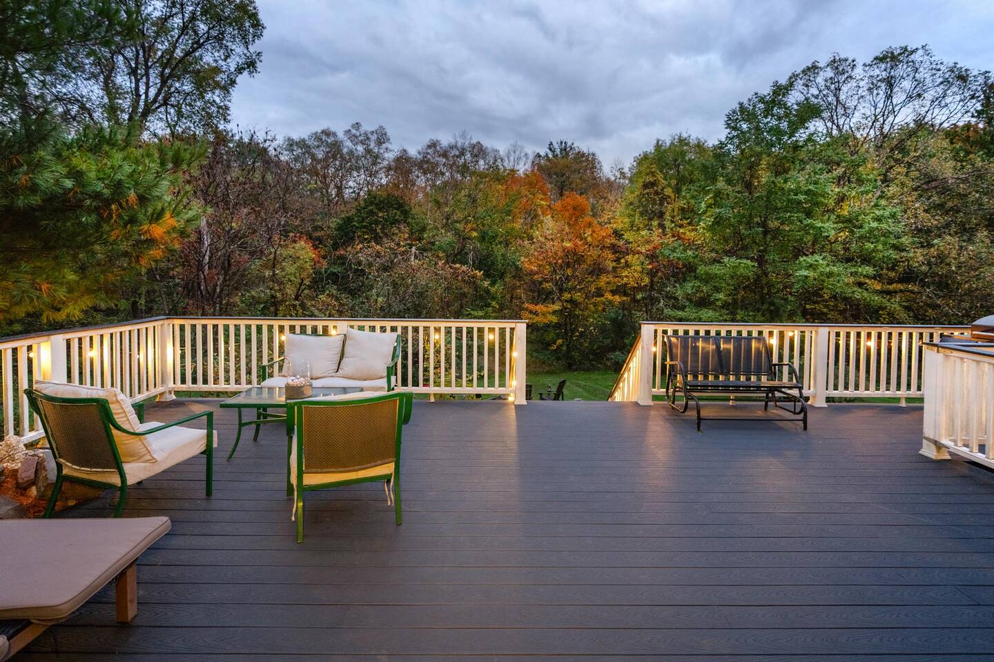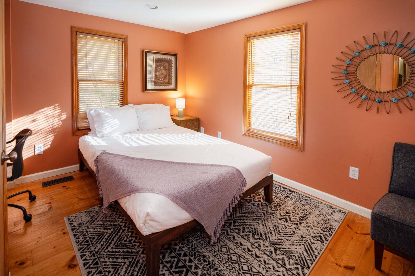This beautifully appointed home is located on a quiet country road and features a large deck with an outdoor dining set as well as a gas grill and fire pit with Adirondack chairs for outdoor relaxation. The home can sleep up to 6 guests in three bedrooms, with the first bedroom featuring a king bed and en suite bathroom with clawfoot tub, the second bedroom featuring a queen and full bed with en suite bathroom, and the third bedroom featuring a full bed and a desk. The kitchen has granite countertops and is fully equipped with modern appliances, and there is a spacious dining room and a living room on the main level. The home also has a main-level bathroom with a washer/dryer and an upstairs common area with a Roku TV. The home is equipped with central heating and air conditioning and offers high-speed WiFi