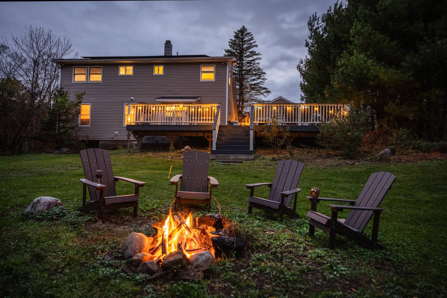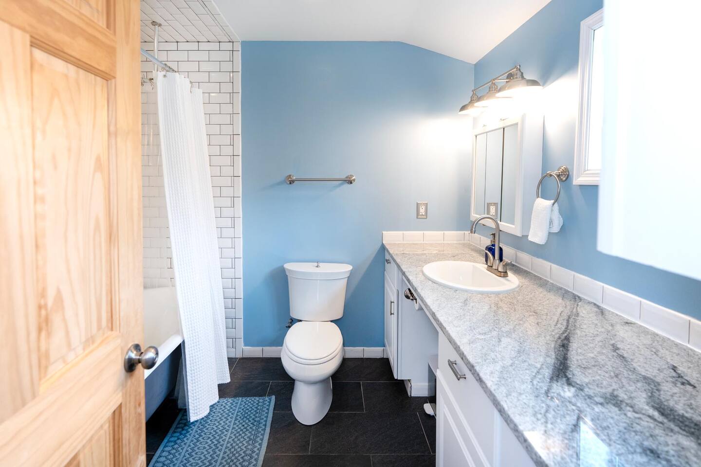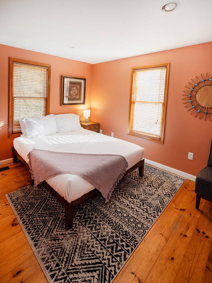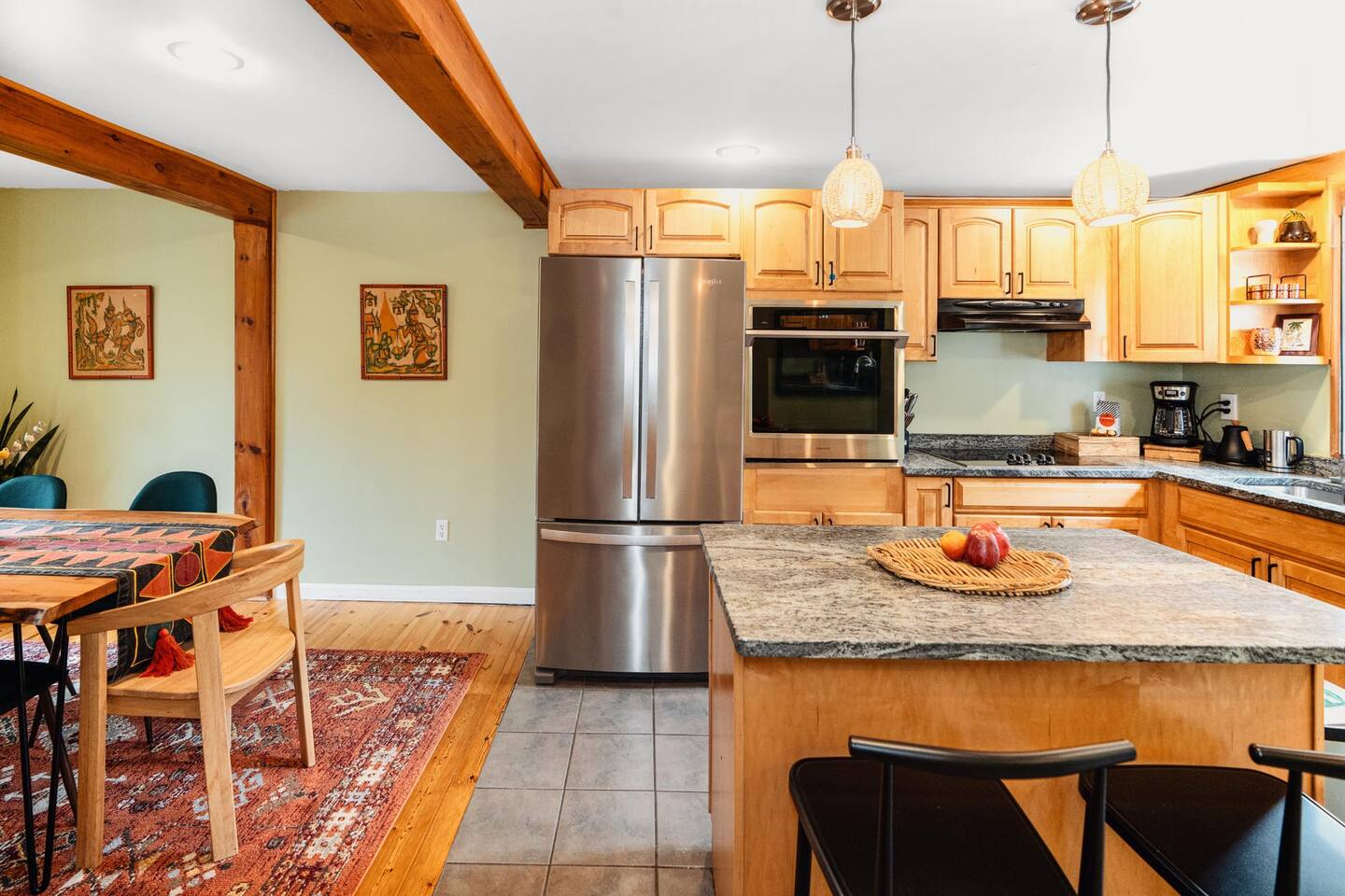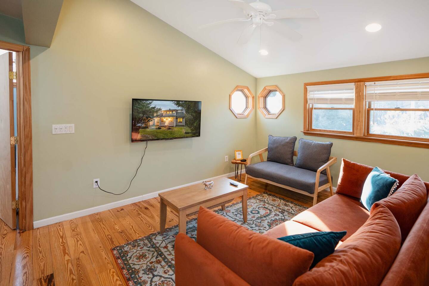 This beautifully appointed home is located on a quiet country road and features a large deck with an outdoor dining set as well as a gas grill and fire pit with Adirondack chairs for outdoor relaxation. The home can sleep up to 6 guests in three bedrooms, with the first bedroom featuring a king bed and en suite bathroom with clawfoot tub, the second bedroom featuring a queen and full bed with en suite bathroom, and the third bedroom featuring a full bed and a desk. The kitchen has granite countertops and is fully equipped with modern appliances, and there is a spacious dining room and a living room on the main level. The home also has a main-level bathroom with a washer/dryer and an upstairs common area with a Roku TV. The home is equipped with central heating and air conditioning and offers high-speed WiFi