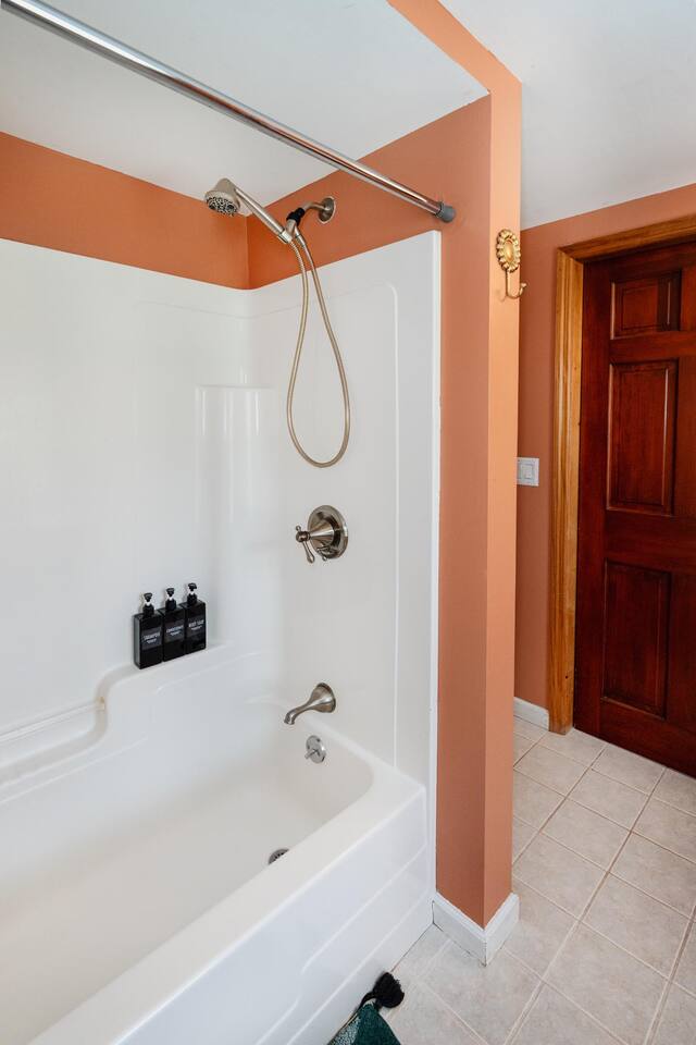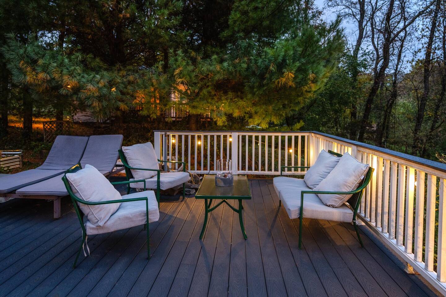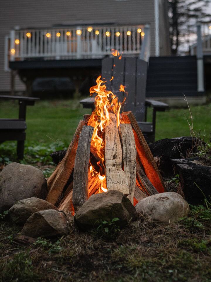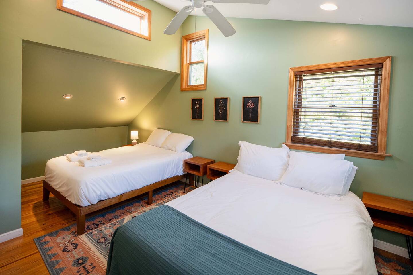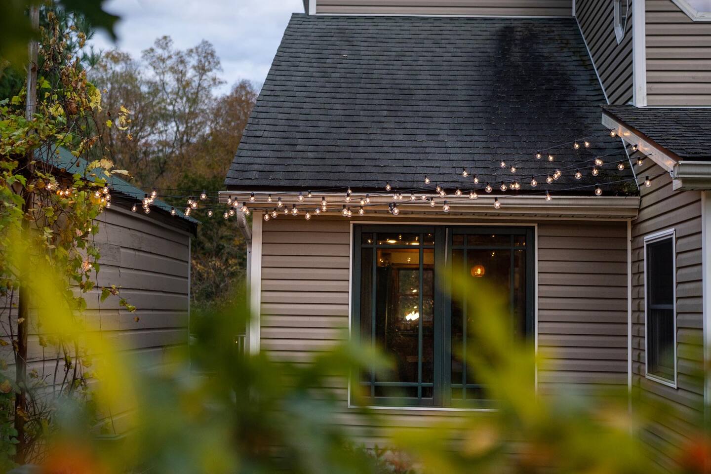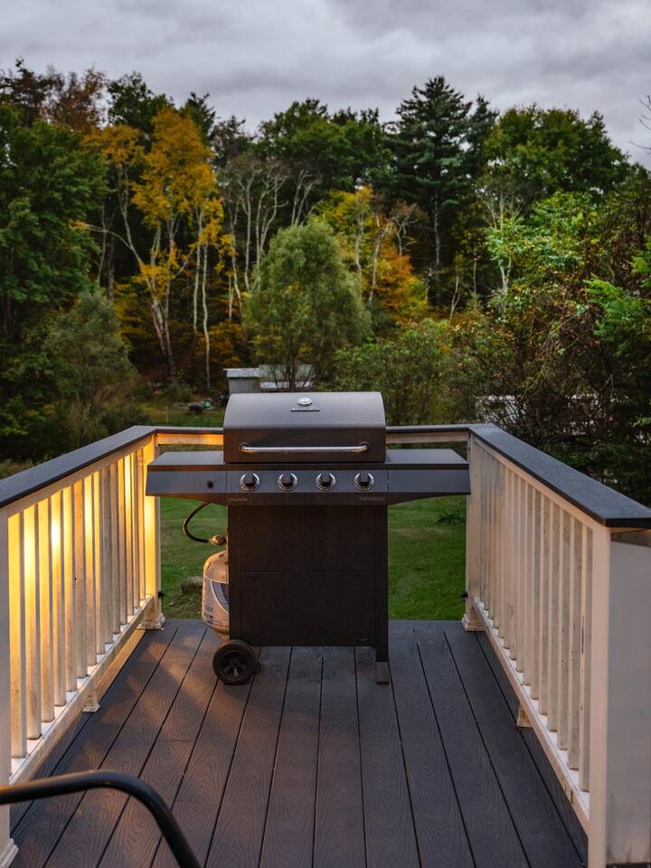 This beautifully appointed home is located on a quiet country road and features a large deck with an outdoor dining set as well as a gas grill and fire pit with Adirondack chairs for outdoor relaxation. The home can sleep up to 6 guests in three bedrooms, with the first bedroom featuring a king bed and en suite bathroom with clawfoot tub, the second bedroom featuring a queen and full bed with en suite bathroom, and the third bedroom featuring a full bed and a desk. The kitchen has granite countertops and is fully equipped with modern appliances, and there is a spacious dining room and a living room on the main level. The home also has a main-level bathroom with a washer/dryer and an upstairs common area with a Roku TV. The home is equipped with central heating and air conditioning and offers high-speed WiFi