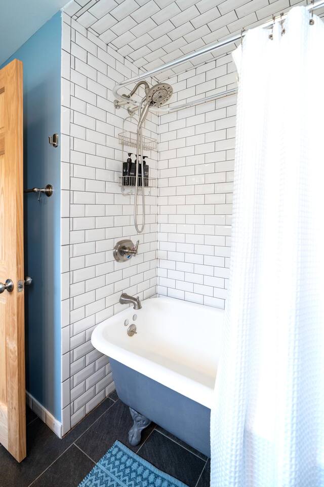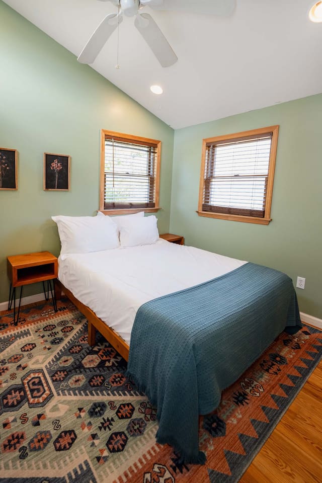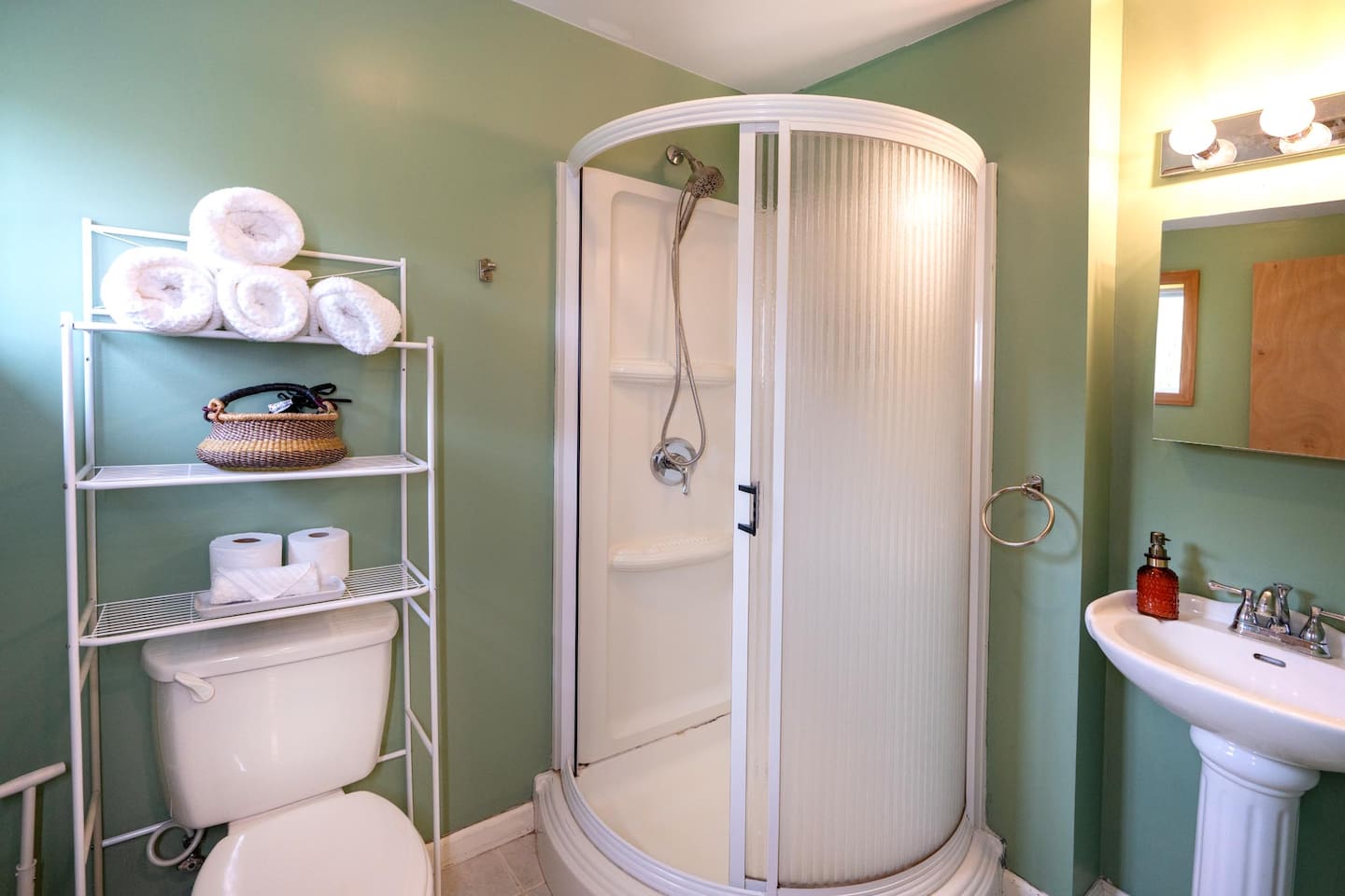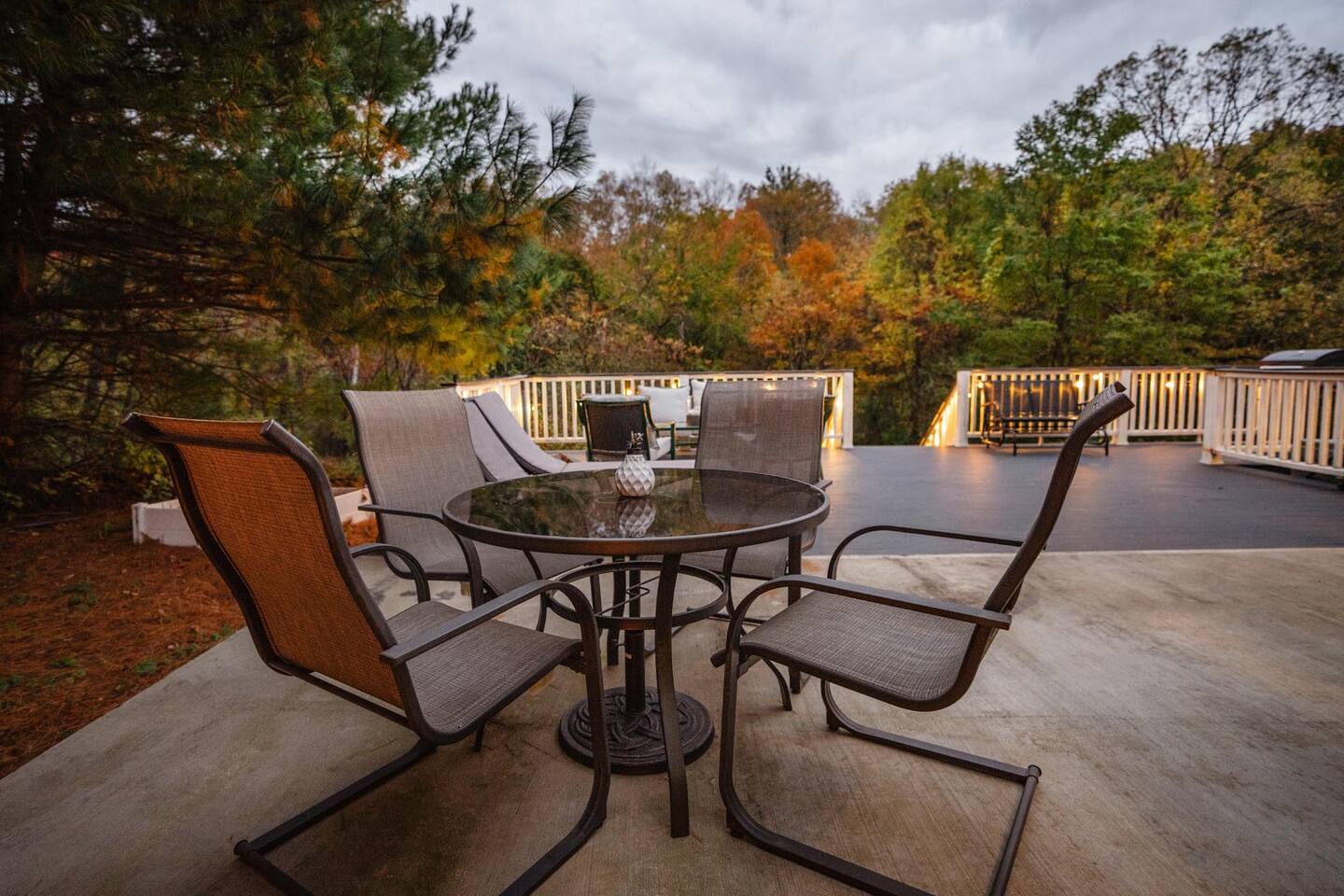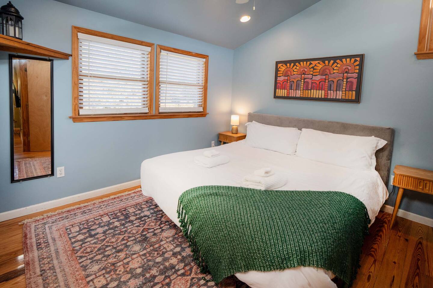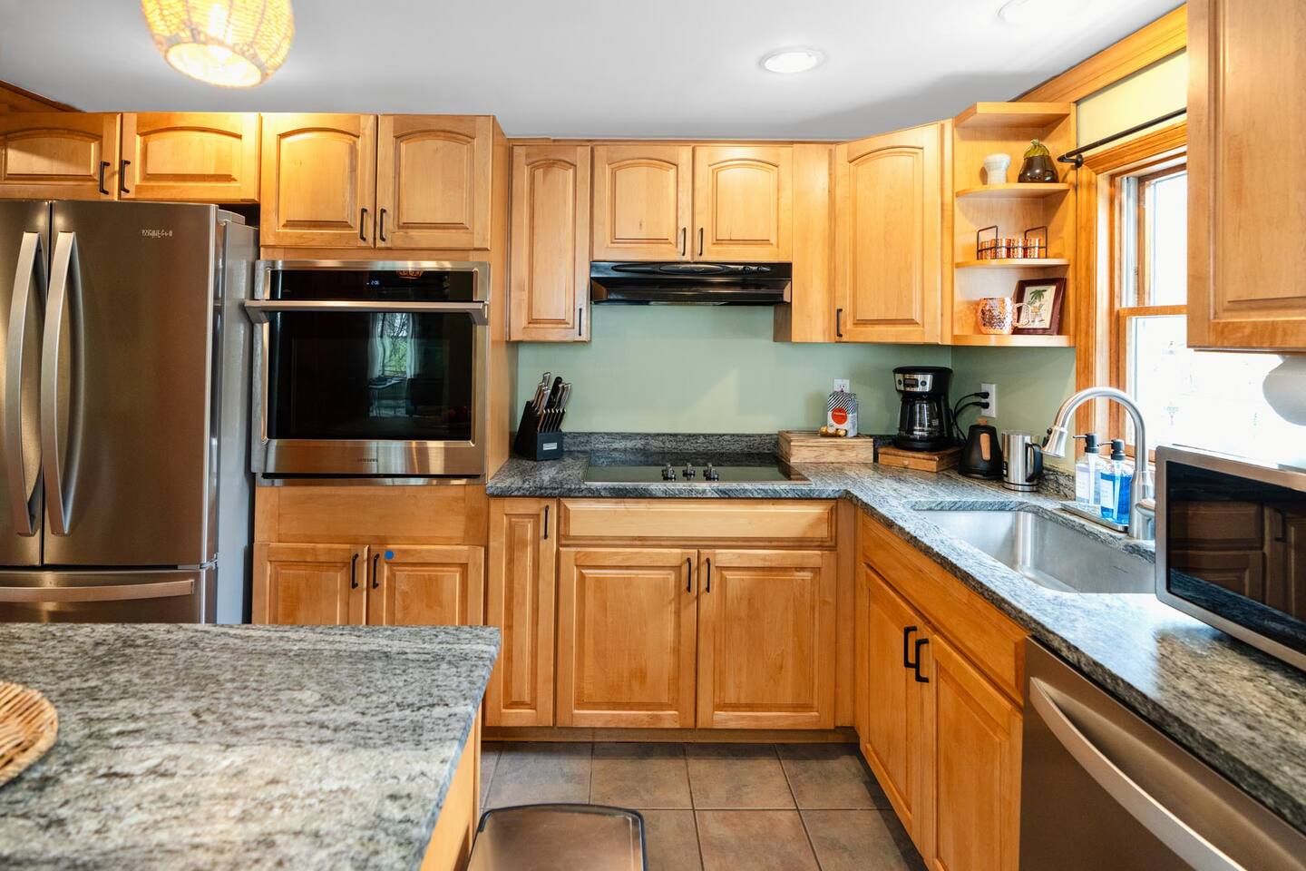This beautifully appointed home is located on a quiet country road and features a large deck with an outdoor dining set as well as a gas grill and fire pit with Adirondack chairs for outdoor relaxation. The home can sleep up to 6 guests in three bedrooms, with the first bedroom featuring a king bed and en suite bathroom with clawfoot tub, the second bedroom featuring a queen and full bed with en suite bathroom, and the third bedroom featuring a full bed and a desk. The kitchen has granite countertops and is fully equipped with modern appliances, and there is a spacious dining room and a living room on the main level. The home also has a main-level bathroom with a washer/dryer and an upstairs common area with a Roku TV. The home is equipped with central heating and air conditioning and offers high-speed WiFi