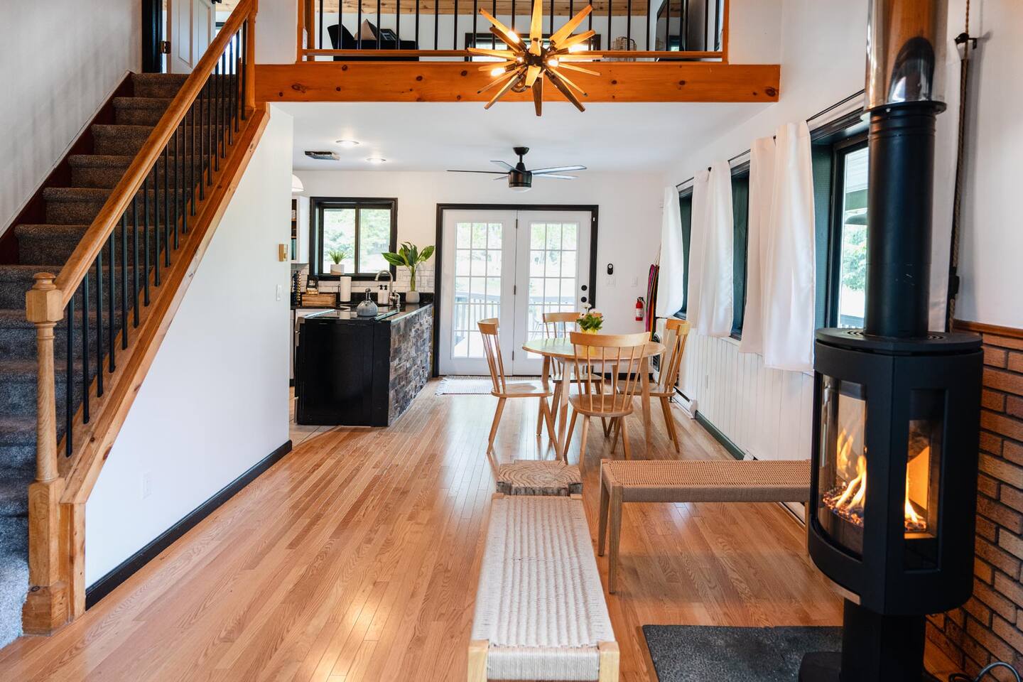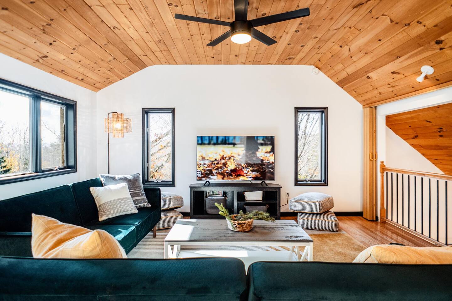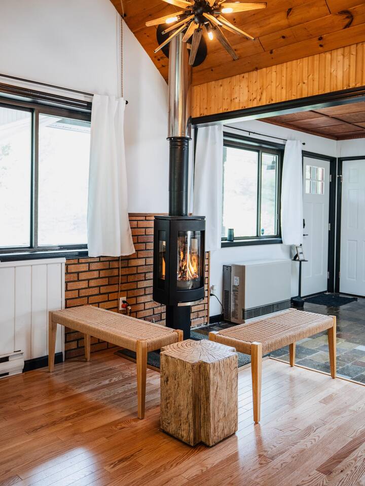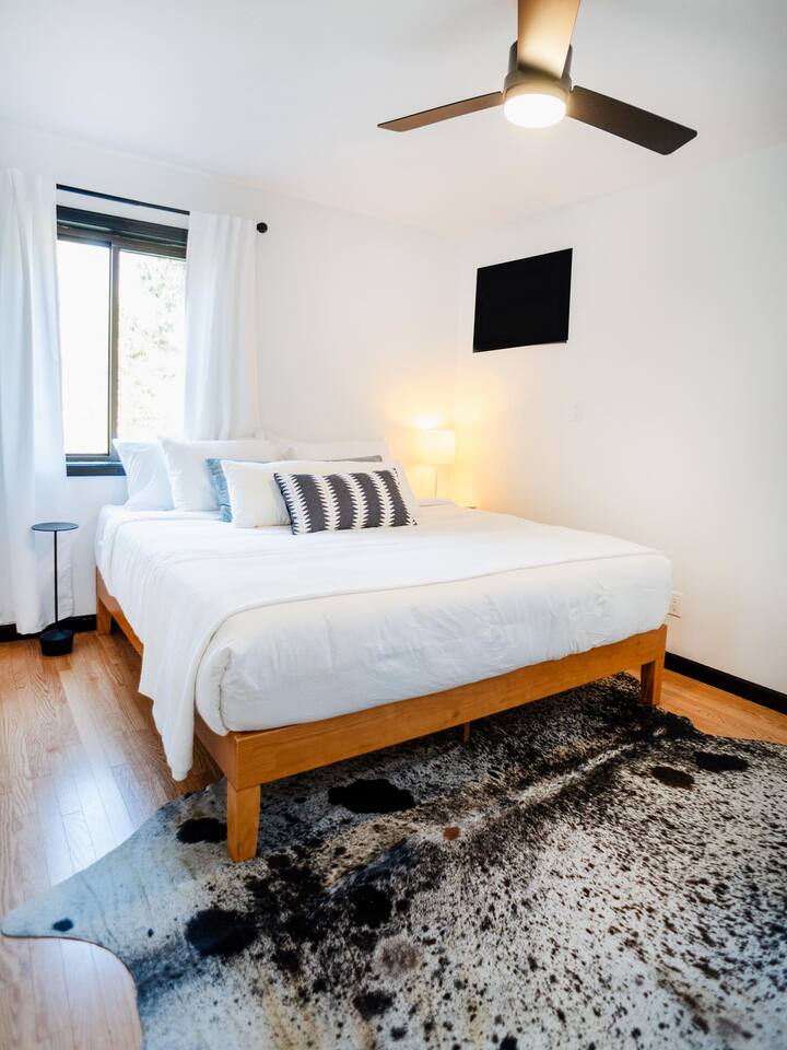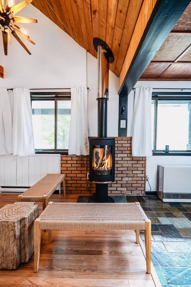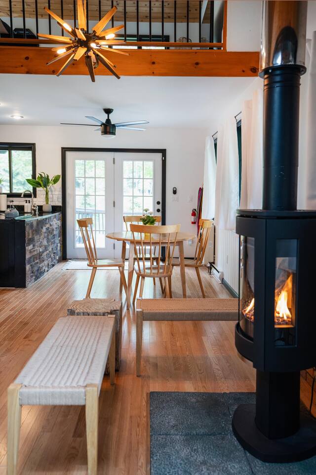 The house features four bedrooms + a bonus loft room (one king-size bed, two queen-size beds, two twin beds, and two convertible sleeper sofas) with large closet space, and plenty of storage room for extended stays - and no detail was spared when creating these plush accommodations. With generous windows on all four sides, guests can choose whether they prefer to wake up to the birds chirping outside their window or watch TV from the comfort of their cozy loft. Wood beams and high ceilings provide a rustic yet modern vibe that will put anyone at ease after exploring the area's many outdoor activities like hiking, kayaking, fishing, and more. And if you're visiting during fall or winter, there's always a roaring gas fireplace waiting for you right inside the living room! It doesn't matter what season, every day spent at The Pond Life is sure to be relaxing and unforgettable.