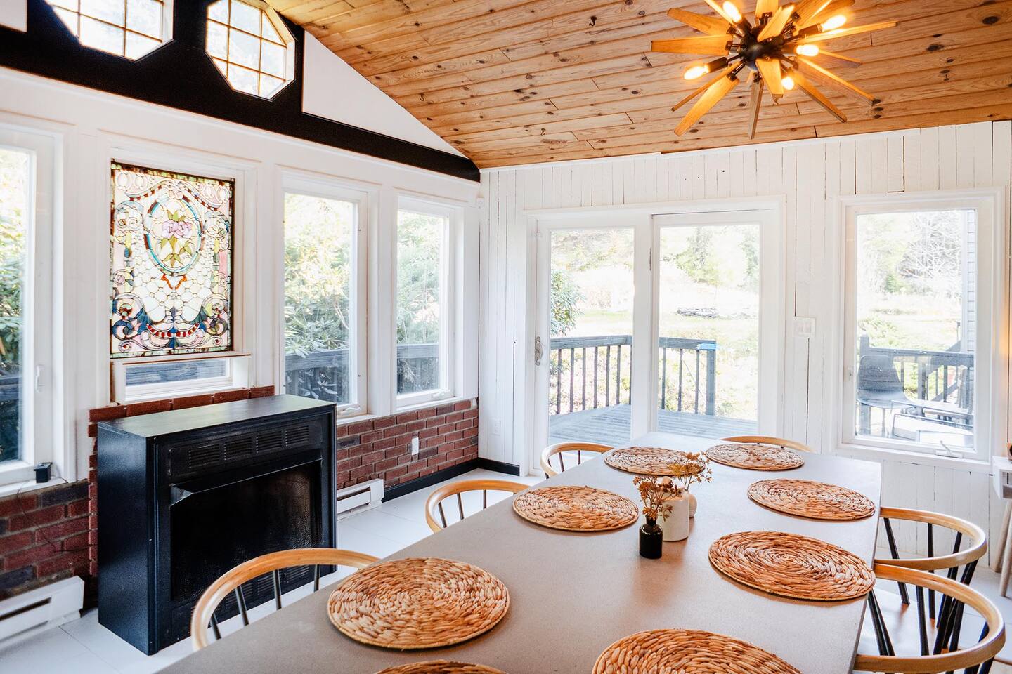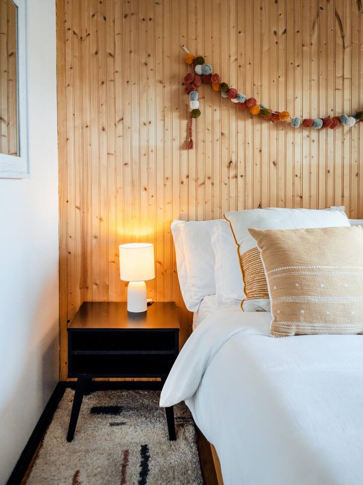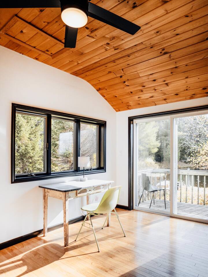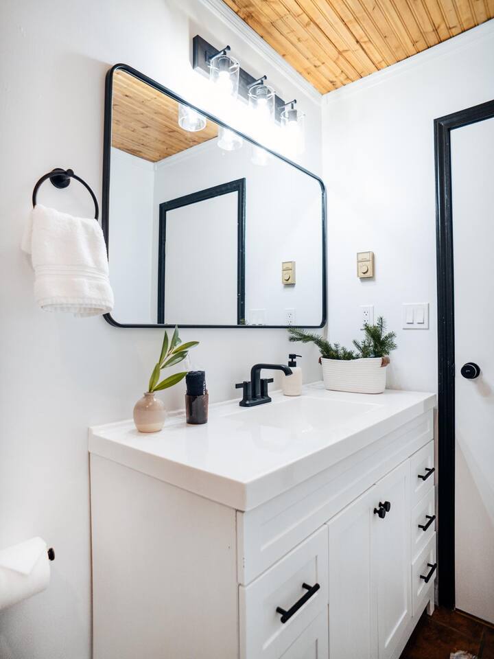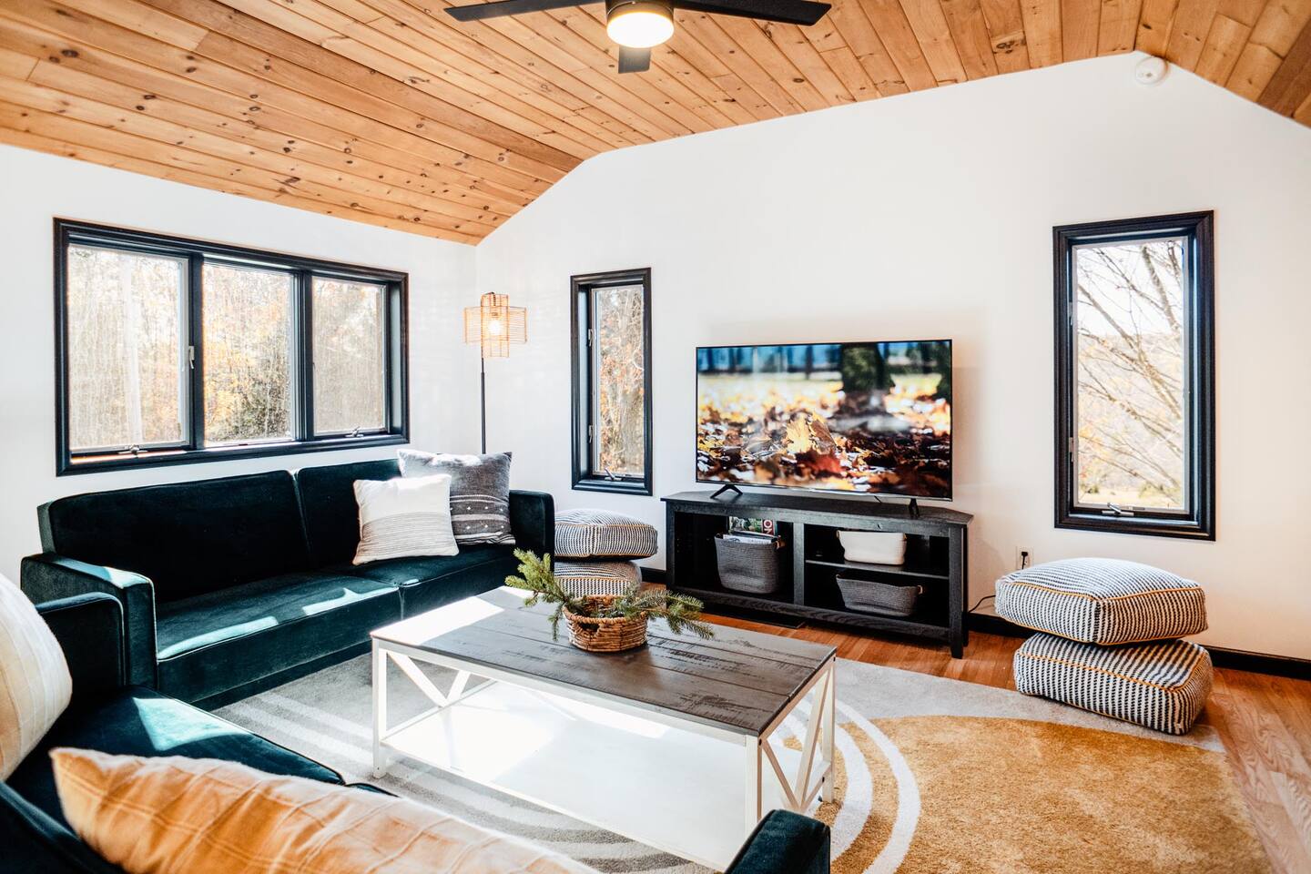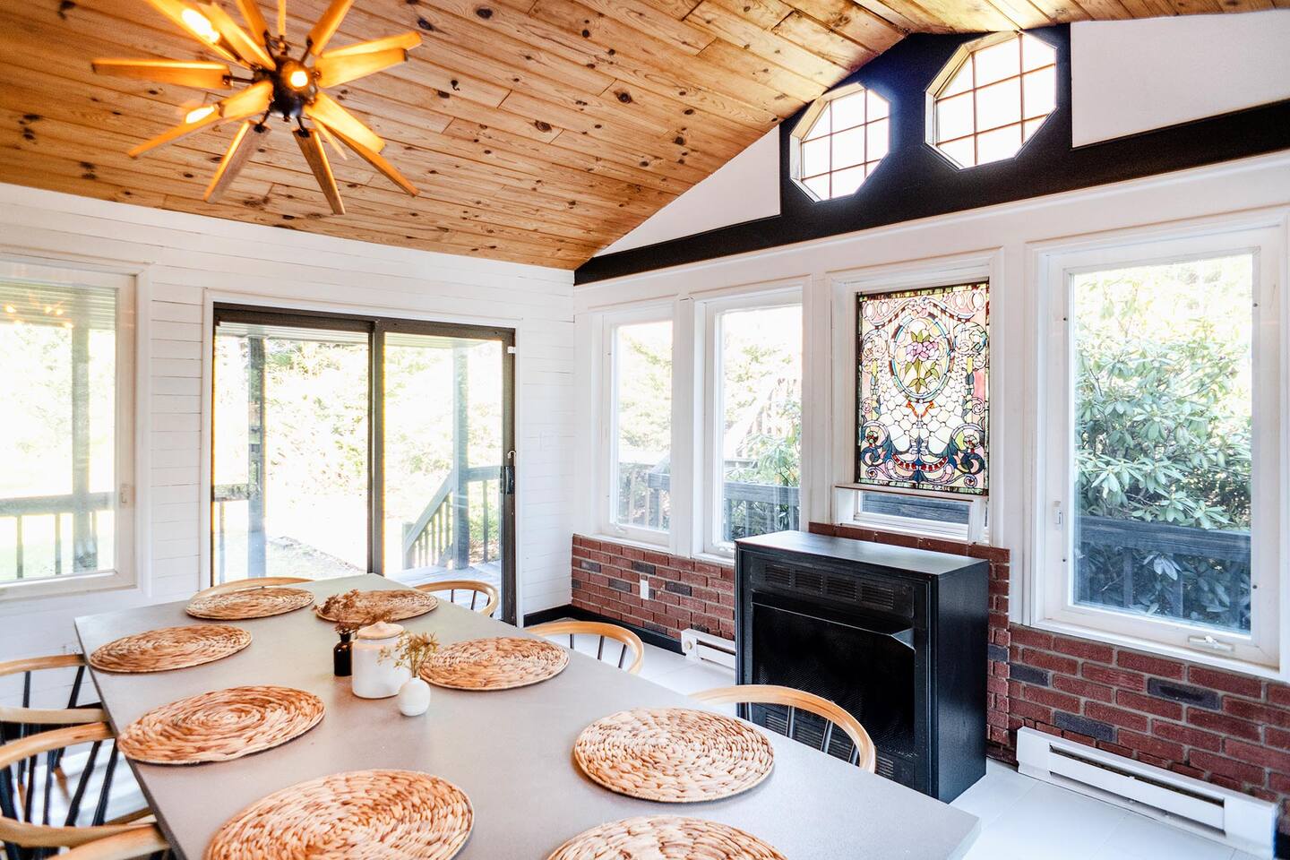 The house features four bedrooms + a bonus loft room (one king-size bed, two queen-size beds, two twin beds, and two convertible sleeper sofas) with large closet space, and plenty of storage room for extended stays - and no detail was spared when creating these plush accommodations. With generous windows on all four sides, guests can choose whether they prefer to wake up to the birds chirping outside their window or watch TV from the comfort of their cozy loft. Wood beams and high ceilings provide a rustic yet modern vibe that will put anyone at ease after exploring the area's many outdoor activities like hiking, kayaking, fishing, and more. And if you're visiting during fall or winter, there's always a roaring gas fireplace waiting for you right inside the living room! It doesn't matter what season, every day spent at The Pond Life is sure to be relaxing and unforgettable.