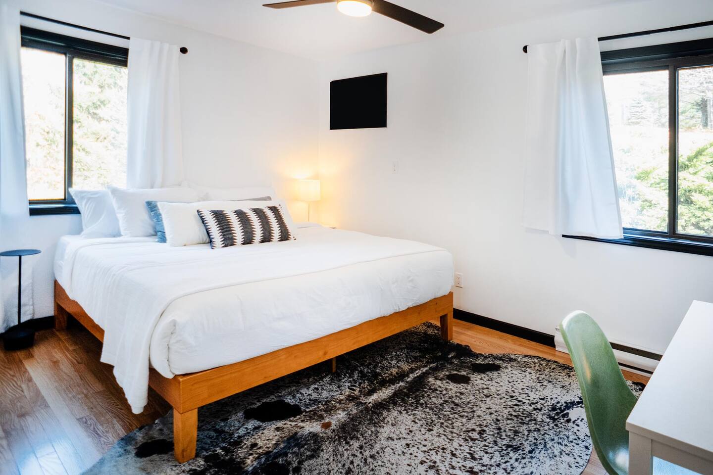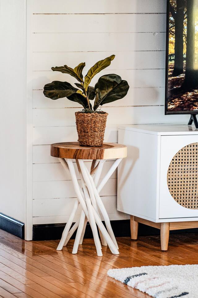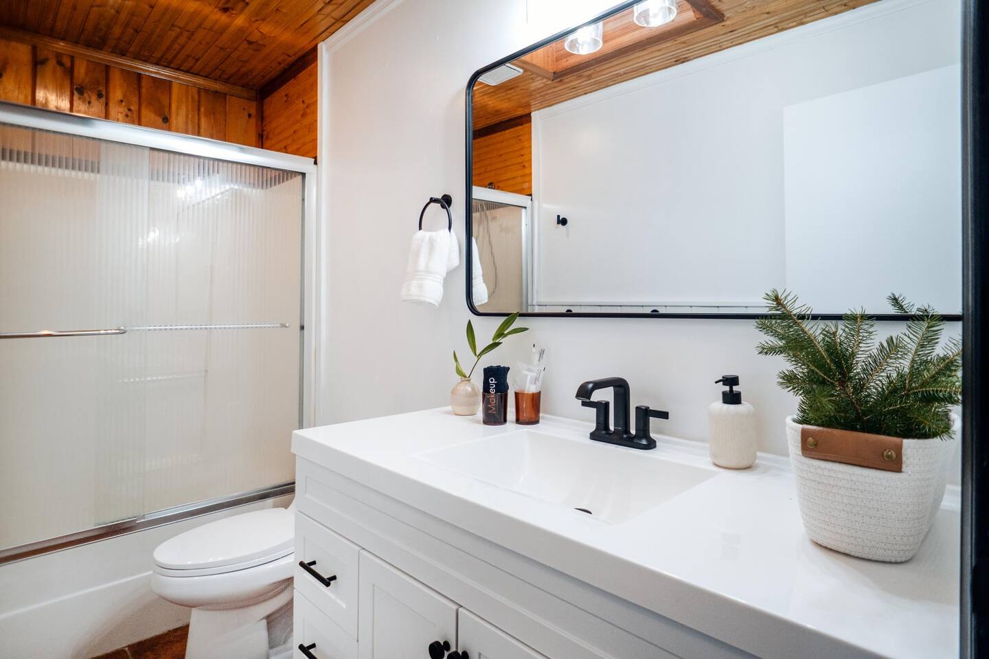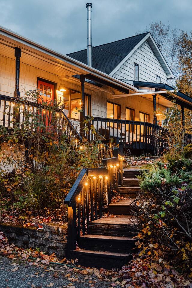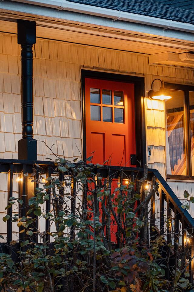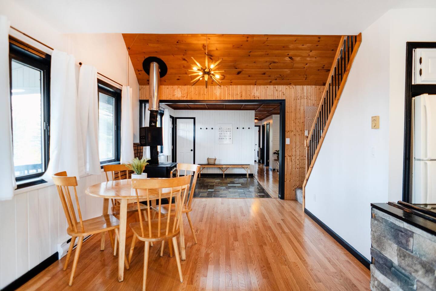The house features four bedrooms + a bonus loft room (one king-size bed, two queen-size beds, two twin beds, and two convertible sleeper sofas) with large closet space, and plenty of storage room for extended stays - and no detail was spared when creating these plush accommodations. With generous windows on all four sides, guests can choose whether they prefer to wake up to the birds chirping outside their window or watch TV from the comfort of their cozy loft. Wood beams and high ceilings provide a rustic yet modern vibe that will put anyone at ease after exploring the area's many outdoor activities like hiking, kayaking, fishing, and more. And if you're visiting during fall or winter, there's always a roaring gas fireplace waiting for you right inside the living room! It doesn't matter what season, every day spent at The Pond Life is sure to be relaxing and unforgettable.
