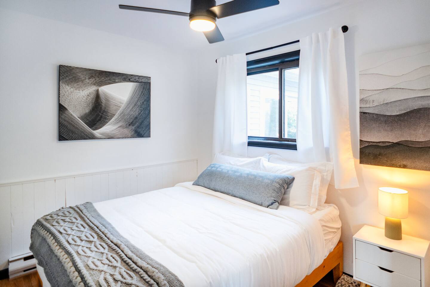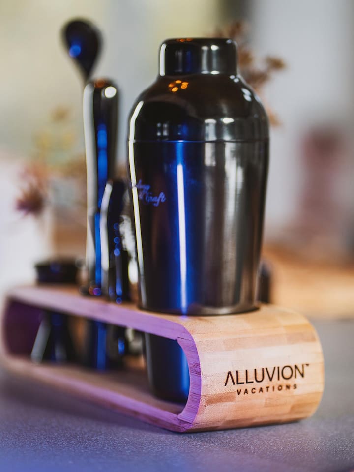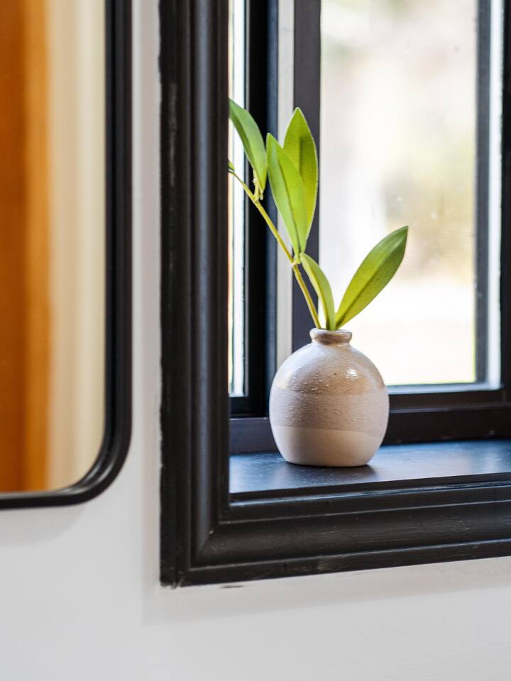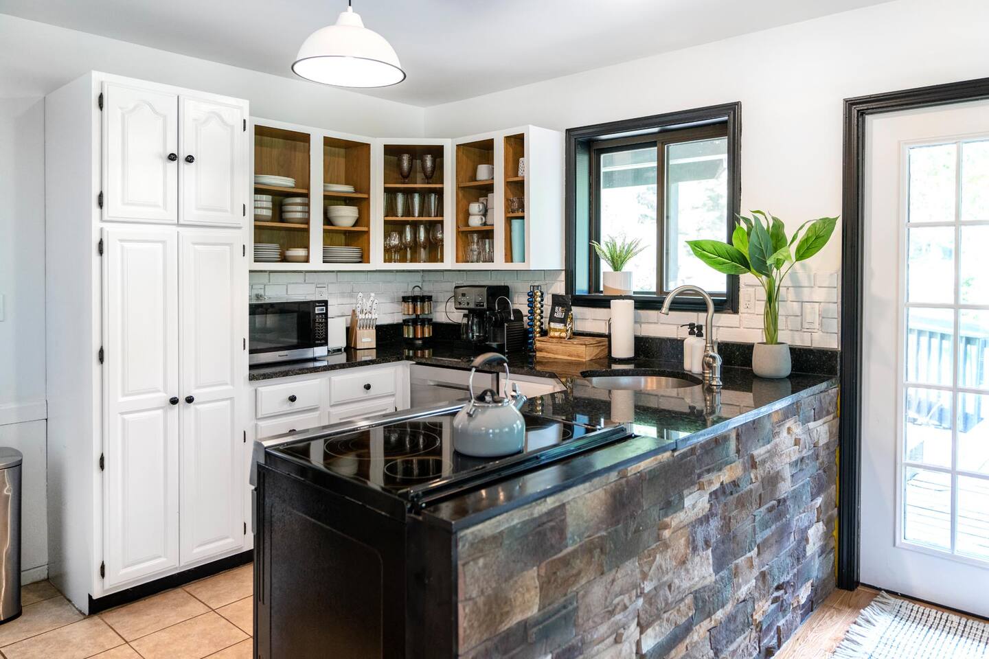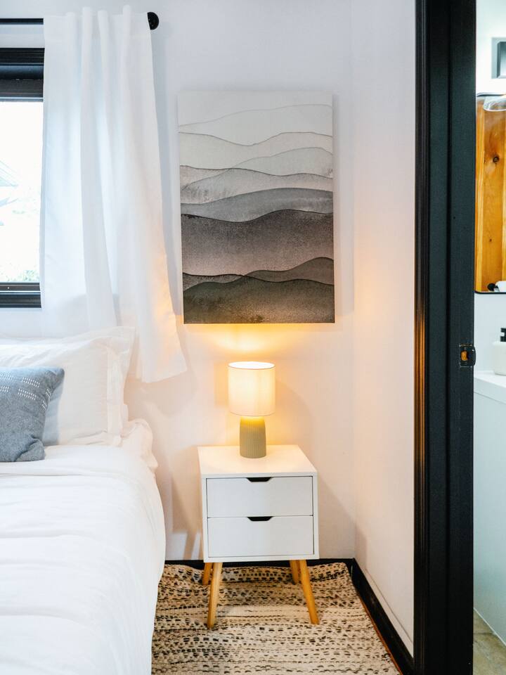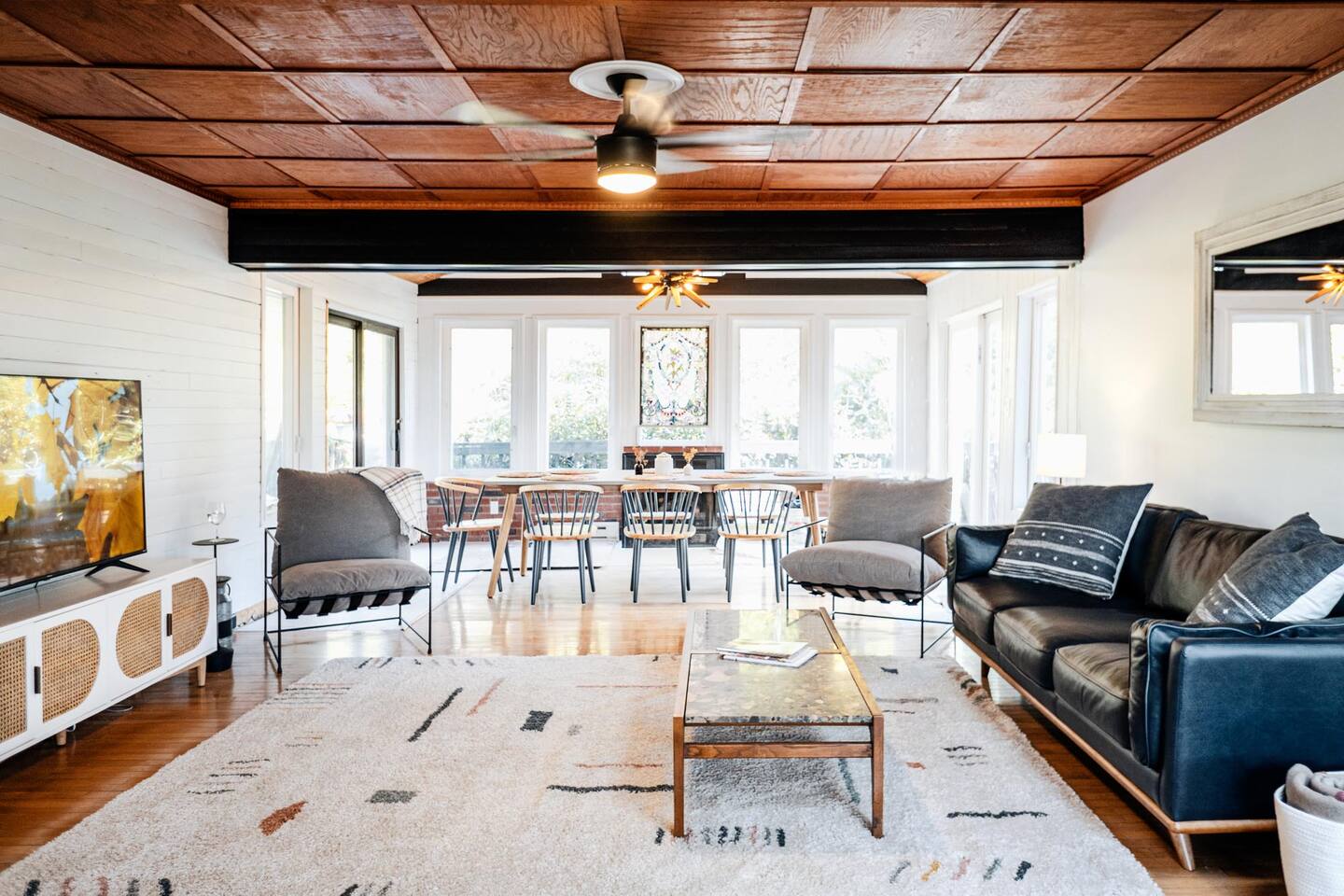 The house features four bedrooms + a bonus loft room (one king-size bed, two queen-size beds, two twin beds, and two convertible sleeper sofas) with large closet space, and plenty of storage room for extended stays - and no detail was spared when creating these plush accommodations. With generous windows on all four sides, guests can choose whether they prefer to wake up to the birds chirping outside their window or watch TV from the comfort of their cozy loft. Wood beams and high ceilings provide a rustic yet modern vibe that will put anyone at ease after exploring the area's many outdoor activities like hiking, kayaking, fishing, and more. And if you're visiting during fall or winter, there's always a roaring gas fireplace waiting for you right inside the living room! It doesn't matter what season, every day spent at The Pond Life is sure to be relaxing and unforgettable.
